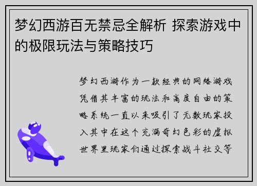 梦幻西游百无禁忌全解析 探索游戏中的极限玩法与策略技巧