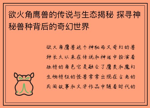 欲火角鹰兽的传说与生态揭秘 探寻神秘兽种背后的奇幻世界
